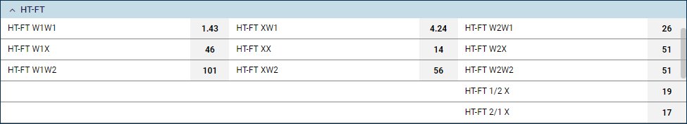 Dużo osób w ogóle omija tę sekcję przeglądając ofertę na dany mecz. Czasami z braku wiedzy na temat tego zakładu, a czasami z obaway przed dziwnym typem, który często widują w kuponach z najwyższymi kursami. Cóż, zastosować oferty ht/ft jest naprawdę wiele. Od ogromnych kursów wyselekcjonowanych w nadzieji na szczęśliwy traf po umiejętnie dobrane typy, podbijające wartość pewnego dla nas kuponu.