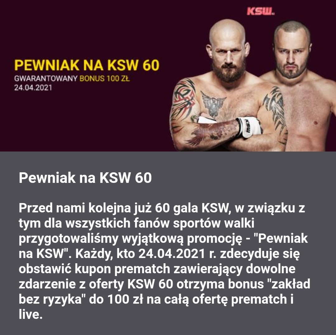 • Warunek: 24.04.2021r. postaw kupon za min. 200 zł brutto zawierający min. 1 zdarzenie związane z galą KSW 60 z oferty prematch, a otrzymasz bonus „zakład bez ryzyka” do 100 zł na całą ofertę prematch i live ważny od 26.04.2021 do końca dnia