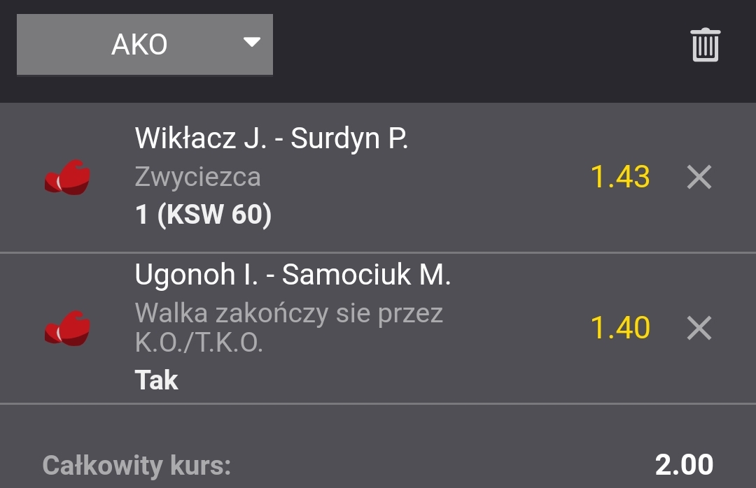 KSW 60 otworzy starcie pomiędzy zawodnikami, którzy powalczą o powrót na zwycięskie tory po przegranych debiutach. Obaj nie wypadli jednak źle we wspomnianych debiutach – Wikłacz postawił się aktualnemu mistrzowi Przybyszowi, a Surdyn miał kilka naprawdę dobrych momentów w konfrontacji ze Stasiakiem.