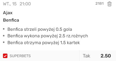 W tym typie skupiamy się na zakładzie „superbets” oferowany przez bukmachera superbet. Wszystkie z 3 zdarzeń wydają się bardzo prawdopodobne gdyż Benfica nie ma nic do stracenia i musi pójść na całość w tym meczu. W poprzednim udało się pokryć wszystkie statystyki z tego typu. Mamy nadzieję że dziś będzie podobnie.