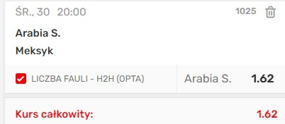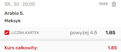 W związku ze stawką meczu – ciekawą opcją do typowania w starciu Arabii Saudyjskiej z Meksykiem wydają się żółte kartki. Trójkolorowi są znani z tego, że lubią grać wysokim pressingiem i wchodzić w kontakt z rywalem. Saudyjczycy w rywalizacji z Polską bardzo często kładli się po faulach, co może zwiastować sporą liczbę upomnień, jeśli sędzia nie zapanuje nad widowiskiem. Linia na powyżej 3,5 kartki daje nam kurs 1.80.