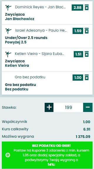 KUPON NA UFC BEZ RYZYKA AŻ DO 199PLN + 100PLN DO ODBIORU + GRANIE BEZ PODATKU