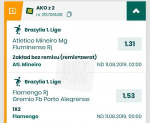 W drugim meczu, będące w gazie Mineiro (5 zwycięstw w ostatnich 7 meczach, 24 pkt) podejmuje Fluminense (12 pkt). To byłby świetny singiel na gołe 1, gdyby nie fakt, że Mineiro potrafi rozczarować, jak np w Copa Libertadores, gdzie jako jedyny zespół brazylisjki odpało w rywalizacji grupowej. Góownie przez słabą formę Fluminense jest to dobry mecz do tego AKO po ubezpieczeniu go DNB.