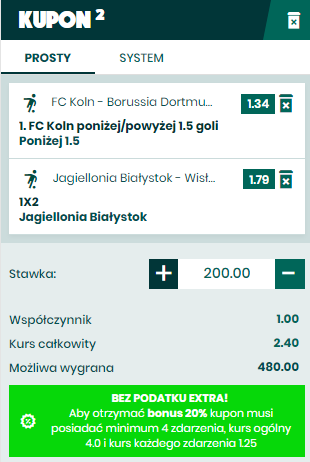 W szóstej już kolejce ESA Jagiellonia podejmuje Wisłę Kraków. Gospodarze rozkręcają się, potwierdzając swoje aspiracje, a ostatnio u siebie pewnie pokonali Górnika 3:1 (po dwóch remisach na wyjezdzie 2:2 z Zagłębiem i 1:1 z Lechią). Wisła gra dobrą piłką, ale u siebie (1:0 Górnik i 4:0 beniaminek ŁKS), na wyjezdzie zaś nie przekonuje, pozostając tam z 0 punktów i 0 zdobyczy bramkowych (porażka 0:1 z Pogonią i bezbramkowy remis z Lechią). Jeżeli w ESA coś może być pewne, to jest to właśnie zwycięstwo Jagiellonii w piątkowym meczu. Gramy 1, a dla ostrożniejszych nie najgorszy kurs jest na 1 DBN – 1,41.