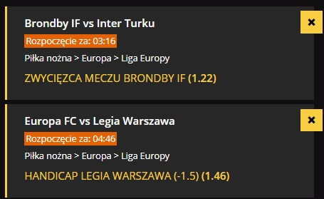 Eliminacje do LE – pierwsza runda. Duńskie Brondby (przed sezonem) podejmuje u siebie Inter Turku (Finlandia, system wiosna-jesień). Nie powinno jednak wytworzyć to niespodzianki. Różnice w jakości piłkarskiej i zapleczu obu klubów są zbyut potężne – Duńczycy powinni bez problemu wygrac ten mecz, traktując go jako element przedsezonowych przygotowań. Zdecydowane 1.