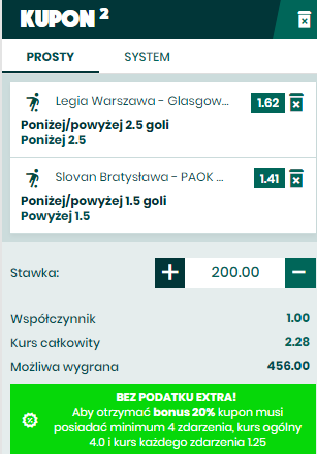 Drugi mecz po który sięgamy w decydującej fazie eliminacji Ligi Europy to pojedynek Solvanu Bratysława z PAOKiem Saloniki. PAOK pokazał się ze świetnej strony w epickich bojach z Ajaxem Amsterdam w eliminacjach Ligi Mistrzów i startuje w tym dwumeczu z pozycji faworyta. Solvan tylko raz dotychczas grał w Lidze Europy i nic nie wskazuje na to, aby byli oni w stanie osiągnięcie powtórzyć. Z Ligi Mistrzów Slovan został wyproszony przez słabą Sutjeskę (słowo – musieliśmy sprawdzić skąd oni są, okazuje się, że z Czarnogóry). Dotychczasowe dwa mecze PAOKu oficjalne w tym sezonie, z Ajaxem właśnie, to średnia 4,5 (!) bramki na mecz. W Amsterdamie byli oni w stanie strzelić 2 gole doprowadzając do tego, że Ajax chwilę był za burtą LM i zapewniając gospodarzom nerwową końcówkę, nie widzimy więc powodu, dla którego mieliby nie strzelić bramki w Bratysławie. Slovan, pomimo wpadki z Sutjeską, potem radził sobie już lepiej i obecnie kontynuuje serię 9 zwycięstw pod rząd ze średnią goli zdobytych blisko 2,5 na mecz. Grecy w dwumeczu z Ajaxem popełnili parę kryminałów w obronie i sądzimy, że Slovan strzeli u siebie przynajmniej bramkę honorową. Można tutaj ryzykować value bet BTTS (kursy ponad 2,00!), ale my na potrzeby tego AKO stawiamy bezpieczne OV 1,5.