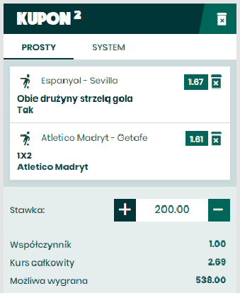 Atletico podejmuje Getafe. Co prawda ostatni sezon w wykonaniu Getafe był najlepszy w historii, ale Atletico Diego Simeone to jest firma i jest w stanie wygrać z każdym, szczególnie u siebie. Nalezy zauważyć, że ostatnie 9 wyjazdów Getafe na stadion Atletico to komplet punktów dla gospodarzy przy zerze (!) strzelonych przez Getafe bramek. Takie serie nie kończą się łatwo, gramy 1 po w naszej ocenie nieco za wysokim kursie.