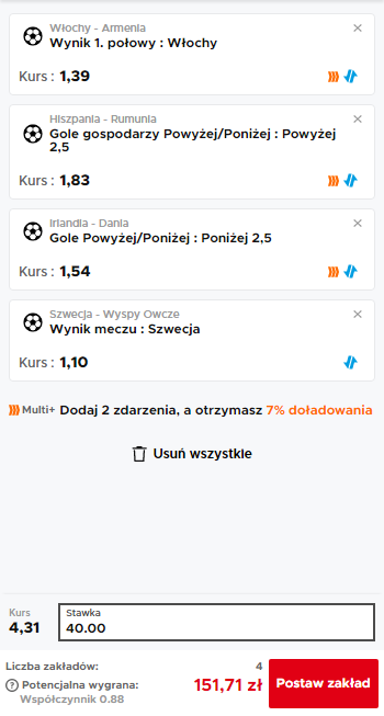 Dołącz do promocji PEWNY ZAKŁAD i postaw kupon wielokrotny z min. 4 zdarzeniami, z minimalnym kursem całkowitym 4.00, na dowolne mecze piłki nożnej. Jeżeli jeden mecz okaże się być nietrafiony, zwrócimy Ci postawioną stawkę, aż do 40 zł! Należy pamiętać, że promocję Pewny Zakład, można połączyć z promocją Mutli+, zwiększając wygrane na kuponach wielokrotnych aż o 50%. Dodając, dwa zdarzenia do swojego Pewnego Zakładu, w przypadku wygranej, grasz bez podatku!