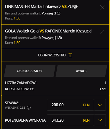 Pojdynek najsłynniejszej być może polskiej patocelebrytki z Kamilą Smogulecką od niedawna znaną jako Zuzje, jednak szerszemu gremium znana jako Luxuria Astaroth z teledysku Donatana do „Nie lubimy robić”. Styl życia obu pań pozostawia wiele do życzenia pod względem sportowym, ale to nie o poziom sportowy tutaj chodzi – jak nie wiadomo o co chodzi, to chodzi o pieniądze. Linkimaster jednak przede wszystkim posiada większe doświadczenie w zmaganiach w formule MMA (bo formuła bójek klubowych i podklubowych zapewne obu paniom nie jest obca), a przede wszystkim ostatnio traktuje kasę z Fame MMA chyba jakby poważniej i nawet można zaobserwować pewne zmiany w jej sylwetce (jak ktoś już decyduje się popatrzeć). Linki powinna zdominować Zuzje niczym którąśtam siostrę Godlewską w debiucie, z racji podobnej przewagi wzrostu i wagi – stawiamy na nią, to murowana faworytka pojedynku, a rywalkę powinna skończyć już w pierwszej rundzie tego pojedynku.