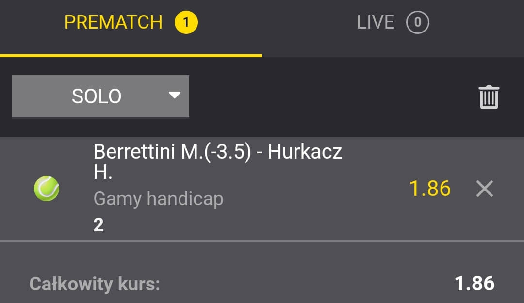 Prognoza: to będzie mecz numer 3 pomiędzy tymi tenisistami. Po raz pierwszy zmierzyli się 3 lata temu, podczas kwalifikacji do Australian Open, Włoch wygrał 7:5,6:3. Rok później podczas Miami Masters, górą był Polak, zwyciężając 6:4,6:3. Berrettini dotarł do półfinału tracąc po drodze tylko 2 sety (w I rundzie i ćwierćfinale), Hurkacz też stracił 2 sety, ale tylko w jednym meczu, IV rundy z Medvedevem. Do tej IV rundy, jako jedyny, awansował bez straty seta, co więcej, ani raz nie dał się przełamać! Hubert Hurkacz w tym turnieju rozegrał aż 202 akcje przy siatce (najwięcej spośród wszystkich tenisistów w tym turnieju!) i wygrał 74% takich akcji. To element gry, dzięki któremu, Polak może przejmować kontrolę nad meczem. Moim zdaniem, zwycięstwo tak pewne i okazałe nad Rogerem Federerem nie było przypadkowe. Tu idealnie, pasowało powiedzenie, gra się tak, jak przeciwnik pozwala. Hubert wszystko odbijał, antycypował uderzenia Rogera i posyłał kończące uderzenia. To zmuszało Maestro, do grania na maksimum ryzyka, a co za tym idzie, Szwajcar popełniał coraz więcej błędów, ale powtórzmy – to Hubert zmusił Federera, do takiej gry. Matteo Berrettini też oczywiście ma swoje atuty, do nich należą, potężny serwis (posłał podczas tego turnieju już 79 asów), mocne uderzenie z forhendu, oraz doświadczenie, grał już na tym etapie turnieju w US OPEN.