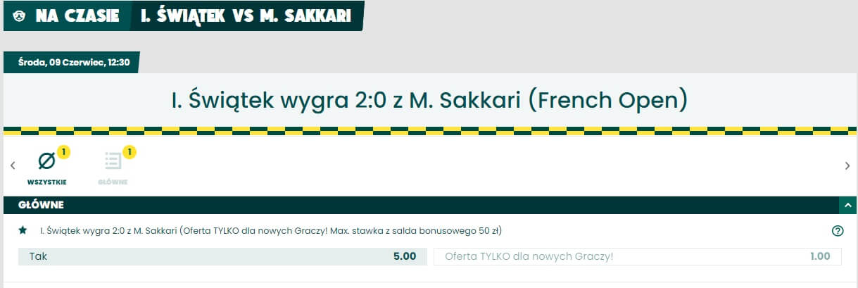 od teraz do rozpoczęcia jutrzejszego pojedynku, a następnie wpłacić co najmniej 50 zł! Następnie należy zagrać dowolnie za cały depozyt (SOLO/AKO), by odebrać bonus 50 zł – właśnie za niego pod tym linkiem (https://betfan.pl/zaklady-bukmacherskie/rozrywka/na-czasie/i-swiatek-vs-m-sakkari/i-swiatek-wygra-2:0-z-m-sakkari-french-open/5851629) należy skorzystać ze specjalnego boosta. Jeśli Świątek wygra, wygrana trafi do gracza na konto główne.