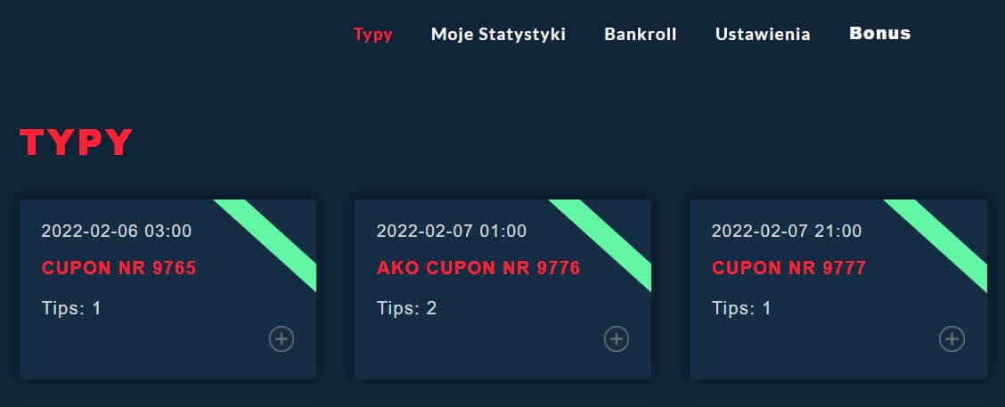 Zakładka „TYPY” – to tutaj znajdziesz dostęp do wszystkich aktywnych analiz przygotowanych przez naszych typerów.