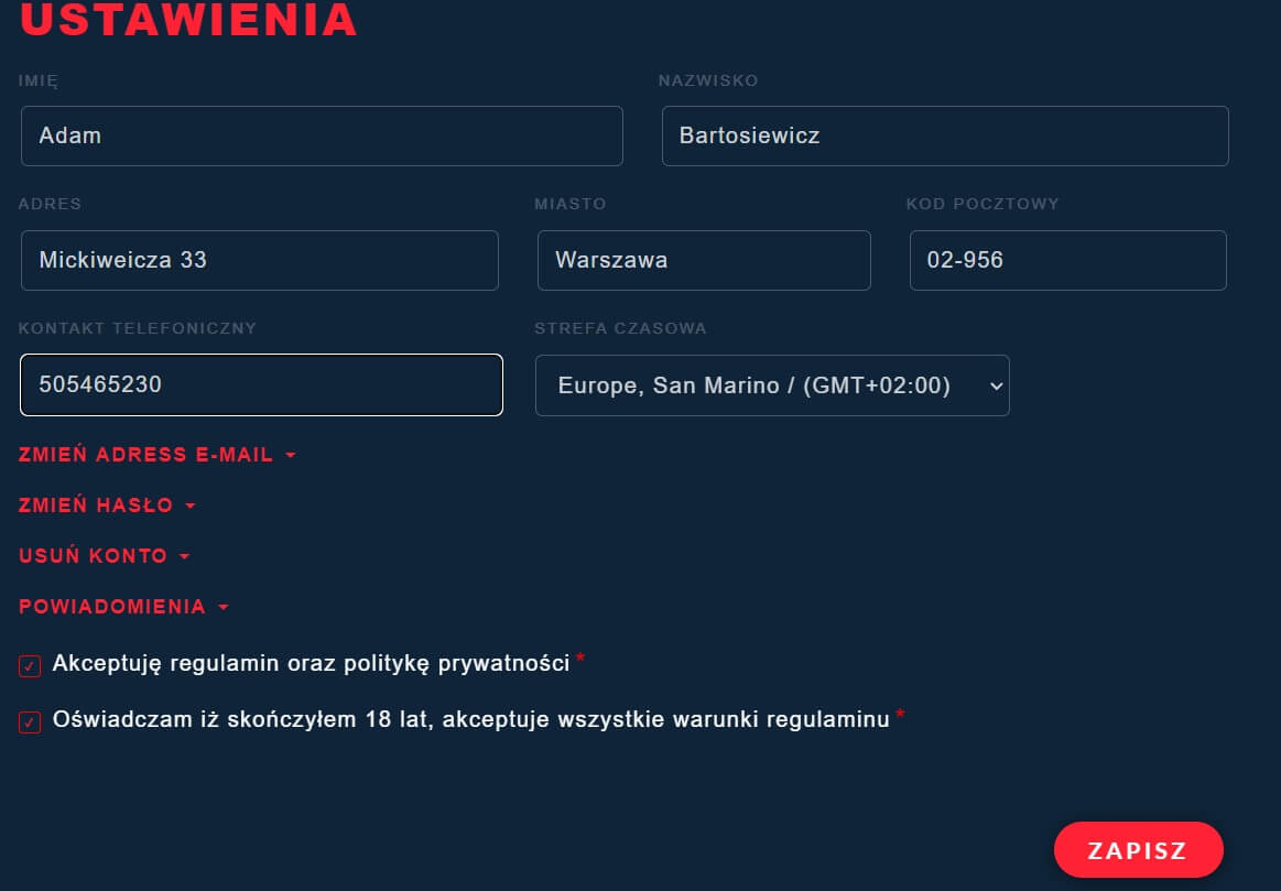 Zakładka „Ustawienia” – To miejsce gdzie możesz zmienić ustawienia swojego konta.