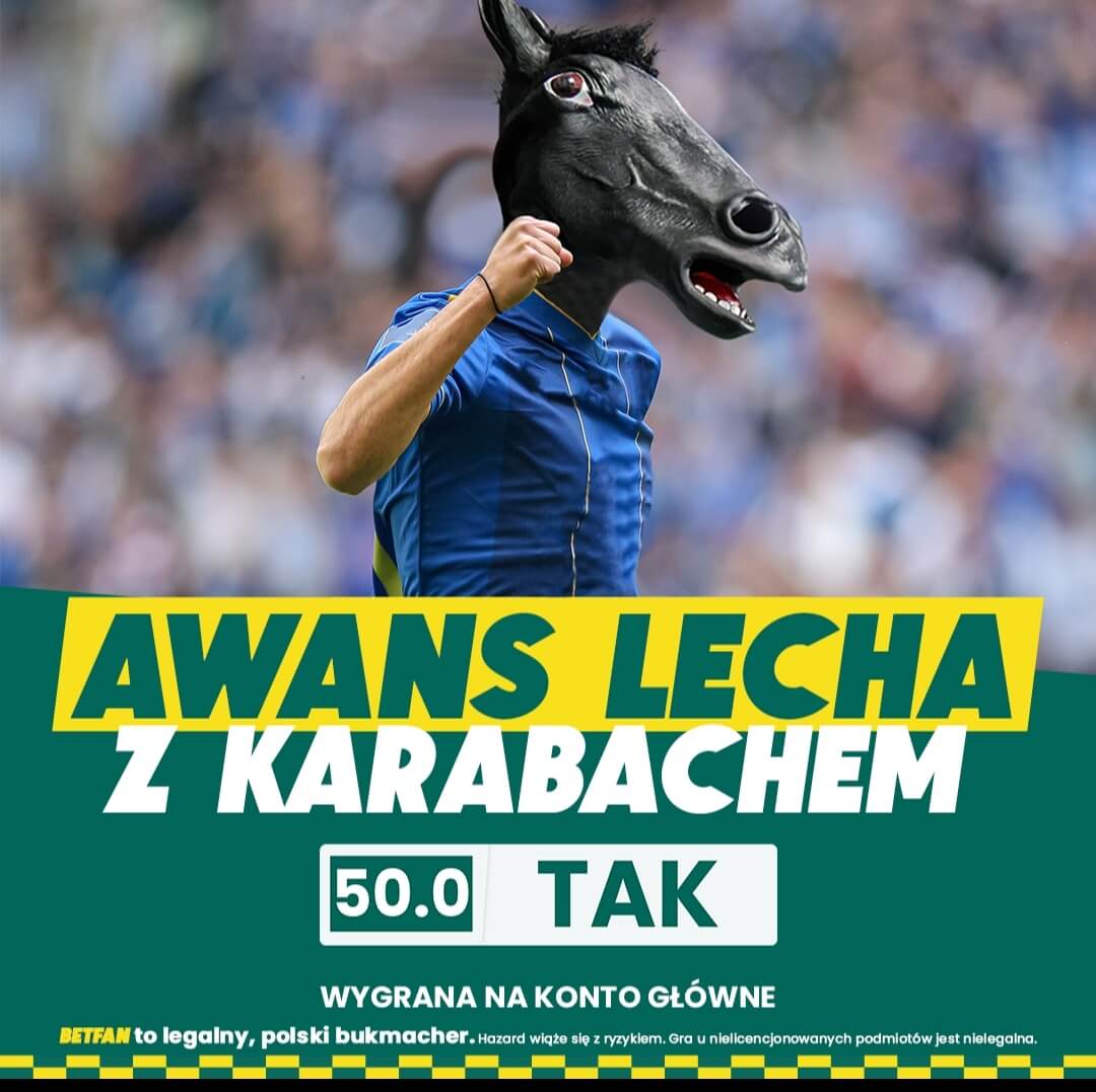 Lech Poznań po wygranej u siebie 1:0 z Karabachem Agdam znacznie zwiększył szanse na awans do drugiej rundy eliminacji Ligi Mistrzów! Czy we wtorek Kolejorz przypieczętuje sukces? Dla nowych graczy w BETFAN mamy specjalną ofertę – możliwość postawienia na awans polskiej drużyny po szalonym kursie 50.0! Stawiając 5 zł, możesz wygrać 220 zł!