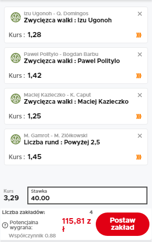 - Zagrać kupon spełniający warunki: Min. 4 zdarzenia ze sportów walki takich eventów jak: UFC, KSW, (można dowolnie łączyć)