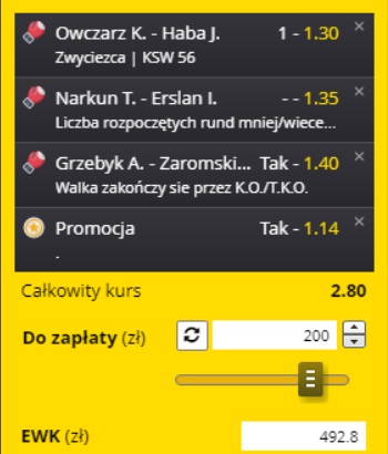 Przed popularnym Żyrafą (17-3) łatwe zadanie. Jego rywal, co prawda dotąd niepokonany (rekord 9-0), ale z rekordem raczej sztucznie napompowanym i bez większych szans w starciu z Narkunem. Ivan Erslan, choć na pewni jest zawodnikiem perspektywicznym i dostarczy włodarzom i kibicom KSW wiele pociechy, to na razie może raczej marzyć o dobiciu do czołówki tej federacji MMA. Jest to zawodnik dość wszechstronny, walczący ciekawie zarówno w parterze, jak i w stójce, ale nie bił się z nikim poważnym, a jedną ze swoich walk przegrał przez nokaut (później obrócono werdykt na no contest). Tomasz Narkun jest zawodnikiem nieporównywalnie bardziej doświadczonym. Dwukrotnie pokonał Mameda Khalidova, co mówi samo za siebie i raczej nie kucnie przed wojowniczym Chorwatem. Czekamy na efektowne poddanie w wykonaniu Żyrafy, a na kupon wrzucamy zaś zakończenie walki maksymalnie w trzeciej rundzie (zakontraktowano pięć), gdyż obaj panowie uwielbiają kończyć swoje pojedynki zdecydowanie wcześniej, niż zakłada to umowa.