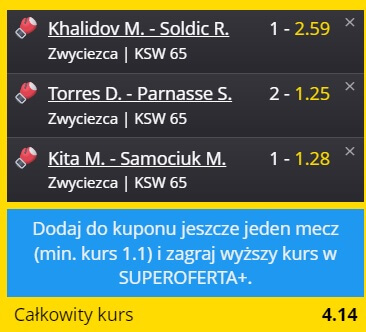 - Warunek: w dniu promocji postaw kupon zawierający wyłącznie zdarzenia związane z galą KSW 65 za min 200 zł i min. kursem całkowitym 3.00 a otrzymasz gwarantowany bonus o wartości 100 zł.
