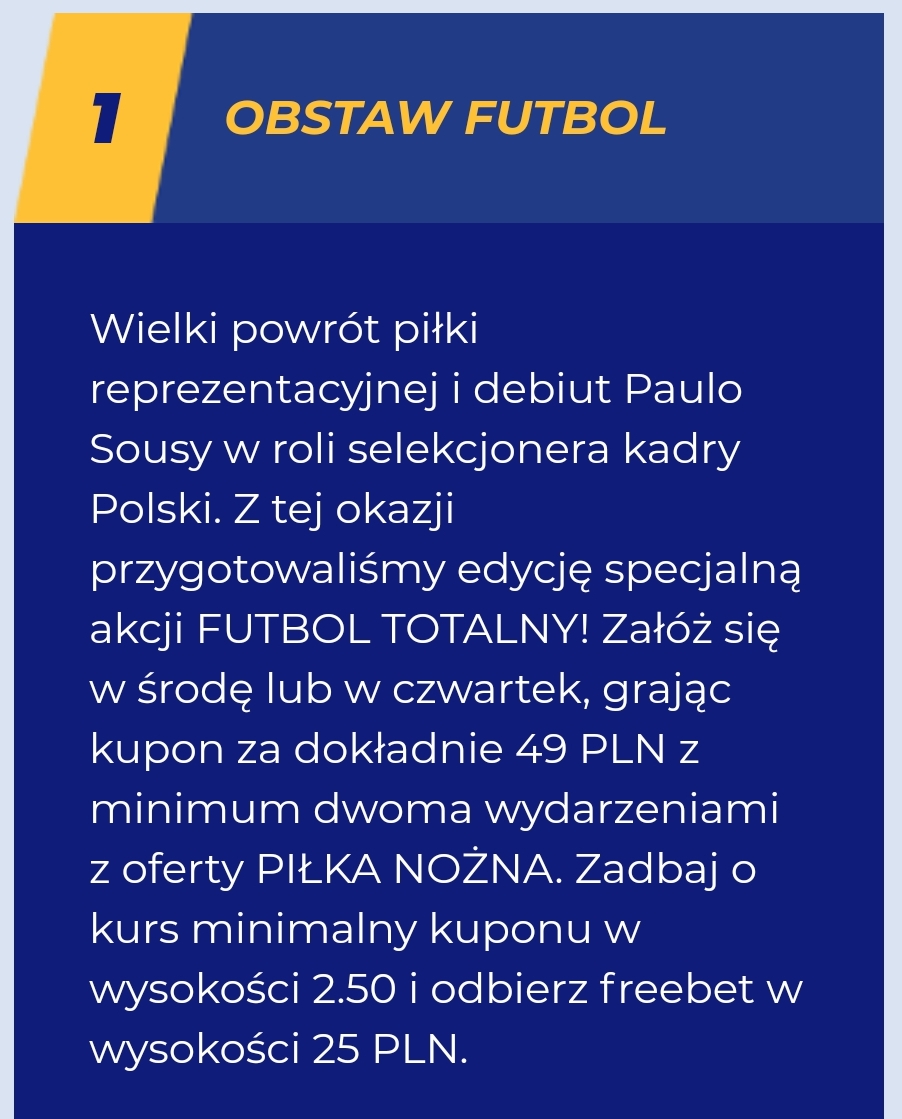 Oprócz DARMOWEGO ZAKŁADU BEZ RYZYKA AZ DO 155 PLN obejmuje Cię promocja na początek eliminacji!