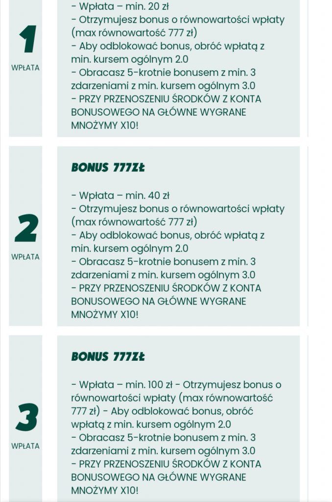 Dokonaj pierwszego depozytu za minimum 60PLN (pamiętaj ,że jeśli Twój pierwszy typ za 100PLN nie wejdzie – betfan zwraca Ci stawkę na Twoje konto główne które możesz wypłacić + Przy drugiej wpłacie do 200PLN + Przy 3 wpłacie do 300PLN )