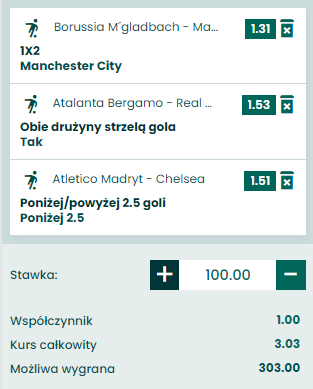 - NA KUPONIE MUSZĄ ZNALEŹĆ SIĘ WYŁĄCZNIE MECZE LIGI MISTRZÓW I/LUB LIGI EUROPY