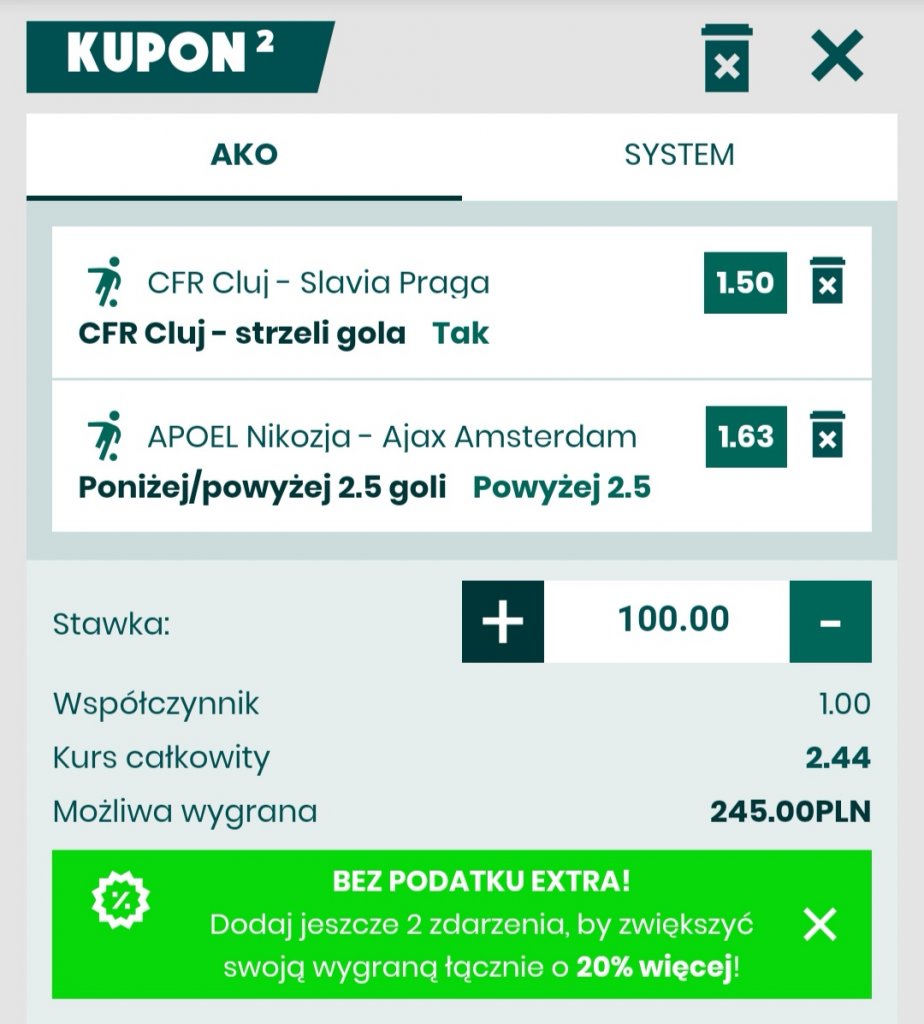 Cluj zaimponował w pełni – nie tylko dochodząc do faz play-off Ligi Mistrzów, ale przede wszystkim stylem, w jakim wyeliminował mocny Celtic Glasgow – po słabym rezultacie u siebie dał radę wygrać na wyjeździe 4:3 praktycznie przez cały mecz goniąc wynik – ogromny zastrzyk pewności siebie dla drużyny. Teraz podejmuje Slavię Praga, która bardzo dobrze rozpoczęła sezon w lidze i pucharach, jednak która kojarzona jest ze słabą grą w pucharach na wyjeździe – 4/5 ostatnich meczy to porażki, a piąty mecz to bezbramkowy remis z dobrze znanym z bojów z warszawską Legią Sheriffem Tyraspol. Slavia pozostaje faworytem bukmacherów, a my widzimy tutaj niemal pewny remis. W związku z tym (i …ujowymi stawkami na normalne handi) raz na rok gramy że Cluj strzeli bramkę – i to jest dobry pomysł na potrzeby AKO w tym przypadku.