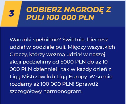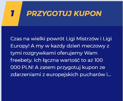 Jakie są warunki promo na Ligę Mistrzów i Ligę Europy – Pamiętaj ,że pierwszy kupon możesz zagrać w 100% bez ryzyka aż do 155PLN (nie zmarnuj tego). Następne kupony graj z promocją któa jest opisana poniżej.