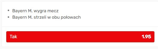 - Promocyjny kupon musi zostać złożony z konta depozytowego za minimum 50PLN, z minimalnym kursem 1.60 na dowolny rynek z regularnej oferty organizatora promocji, na mecz Salzburg – Bayern