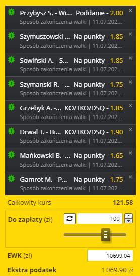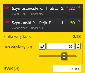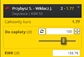 - W dniu gali KSW 53: Reborn (sobota, 11.07.2020) postaw dowolny kupon z min. 1 zdarzeniem z KSW za min. 40 PLN, a otrzymasz gwarantowany bonus w wysokości 20 PLN.