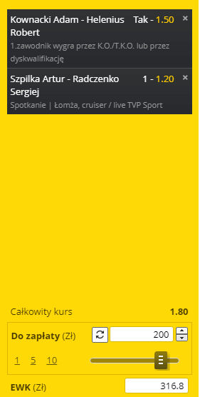 Do ringu w ten weekend po raz kolejny wejdzie najlepszy polski zawodnik wagi ciężkiej, Adam Kownacki (20-0, 15 KO). Jego rywalem tym razem będzie mogący pochwalić się świetnymi warunkami fizycznymi Fin, Robert Helenius (29-3, 18 KO). Pojedynek ten będzie eliminatorem do walki o należący do Anthony’ego Joshuy pas organizacji WBA. Zdecydowanym faworytem pojedynku w Barclays Center będzie Adam Kownacki. Niepokonany Polak zmierza ku walce o pas, a każde kolejne zwycięstwo na zawodowych ringach znacznie go do tego celu przybliża. Kwestią czasu wydaje się więc pojedynek z jednym z aktualnych mistrzów świata czołowych organizacji, Anthonym Joshuą lub Tysonem Furym. Jego rywal, chociaż ma już za sobą walki z wysoko notowanymi zawodnikami, notowany jest dopiero w czwartej dziesiątce rankingu najlepszych ciężkich. Podsumowując, trudno jest wierzyć, że pojedynek ten może zakończyć się innym rezultatem niż zwycięstwo „Babyface” przez KO lub TKO. Jego rywal, mimo iż ma na koncie kilka sporych sukcesów, zdążył już nieco zardzewieć i na dobrą sprawę nigdy nie zawitał w ścisłej światowej czołówce. Z kolei przed Polakiem właśnie otwierają się wrota do walk o najwyższe bokserskie laury. Żeby jednak przez nie przejść, będzie musiał najpierw rozprawić się z „Nordyckim Koszmarem”, najlepiej w przekonującym stylu.