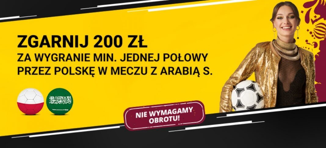 3. Zagraj pierwszy kupon SOLO, na zwycięstwo reprezentacji Polski w przynajmniej jednej połowie w starciu grupowym na MŚ z Arabią Saudyjską (numer zakładu: 28324092) z oferty przedmeczowej za co najmniej 4 zł. (WAŻNE: tylko pierwszy zakład jest brany pod uwagę)