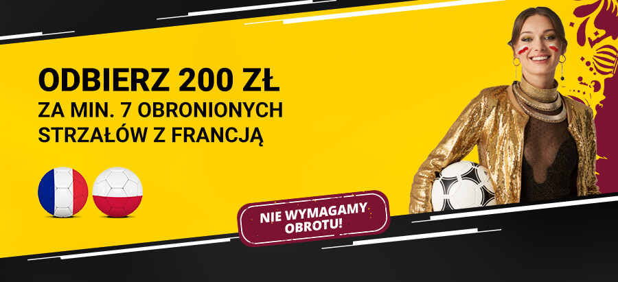 7 strzałów obronionych z Francją. Jeżeli kupon okaże się wygrany otrzymasz dodatkowe 200 zł w KASIE do wypłaty, które możesz od razu wypłacić, bądź przeznaczyć na dalszą grę! Sprawdź szczegóły promocji.