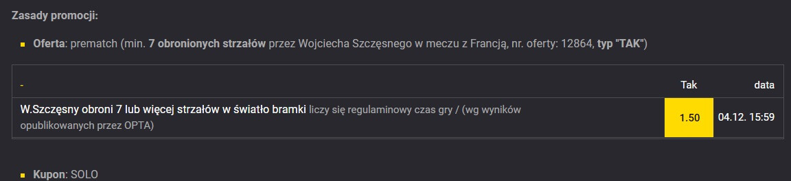 3. Zagraj pierwszy kupon SOLO, na min. 7 obronionych strzałów przez Wojciech Szczęsnego w meczu z Francją (numer zakładu: 12864, typ „TAK”) z oferty przedmeczowej za co najmniej 4 zł. (WAŻNE: tylko pierwszy zakład jest brany pod uwagę)