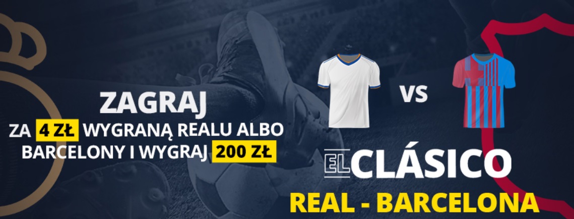 El Clasico coraz bliżej! Już w niedzielę 20 marca o godzinie 21:00 będziemy świadkami kolejnego show w wykonaniu zawodników Barcelony i Realu. Stawiając 4 zł na zwycięstwo Realu albo Barcelony, do każdego wygranego kuponu dorzucamy 200 zł bonusu. Wystarczy w dniach 18-20.03.2022 dokonać rejestracji, wpłacić 50 zł w ramach pierwszego depozytu oraz zagrać pierwszy kupon za min. 4 zł na zwycięstwo Realu (1) albo Barcelony (2). Jeżeli kupon okaże się wygrany otrzymasz dodatkowy bonus w postaci 200 zł. Sprawdź szczegóły promocji.