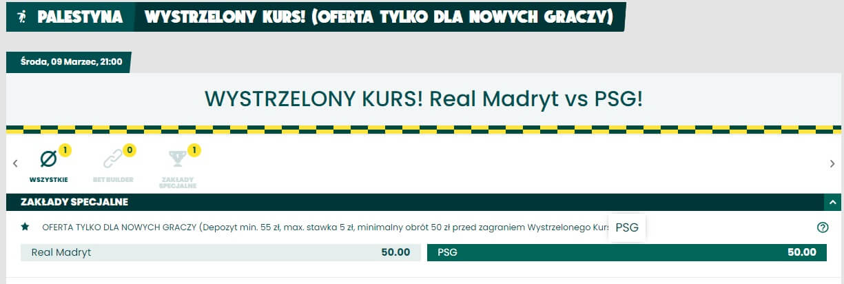 - Zagraj zakład na zwycięstwo Realu lub PSG po kursie 50.0 w hicie Ligi Mistrzów (wybór należy do Ciebie!) W TYM MIEJSCU (nie z oferty głównej na ten mecz)