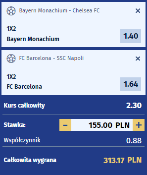 Po remisie na San Paolo 1:1, czas na rewanż Barcelony i Napoli na Camp Nou. Dzięki bramce zdobytej na wyjeździe Barca ma więc silną pozycję przed drugim spotkaniem. Zwycięstwo, bez względu na różnicę bramkową, wystarczyłoby, aby Blaugrana awansowała do ćwierćfinału i zmierzyły się z (na 99,9%) Bayernem Monachium. Ale Napoli nie pojedzie do Barcelony jako chłopiec do bicia, zwłaszcza że Włosi byli przekonujący w pierwszym meczu i mogli go nawet wygrać. Barcelona może być w lekkim dołku po utracie mistrzostwa Hiszpanii na rzecz odwiecznego rywala Realu Madryt na ostatniej prostej. Nie mniej jednak u siebie Barca jest nadal solidna: 19 zwycięstw, 3 remisy, 1 porażka na Camp Nou we wszystkich rozgrywkach. Natomiast podczas ostatnich 5 wyjazdów Napoli przegrał 3 razy, odniósł tylko 1 zwycięstwo i raz podzielił się punktami. W lidze Napoli zajęło zaś najniższe miejsce od lat, awans do europejskich pucharów w przyszłym sezonie zapewniając sobie tylko ze względu na triumf w rozgrywkach Coppa Italia. Swoją szansę w tym dwumeczu drużyna z Sycylii miała, ale zaprzepaściła ją remisując bramkowo u siebie. Barca wygra ten mecz, gdyż nie ma tu miejsca na kalkulacje, a awans do dalszej fazy rozgrywek jest tej drużynie obecnie bardzo potrzebny mentalnie.