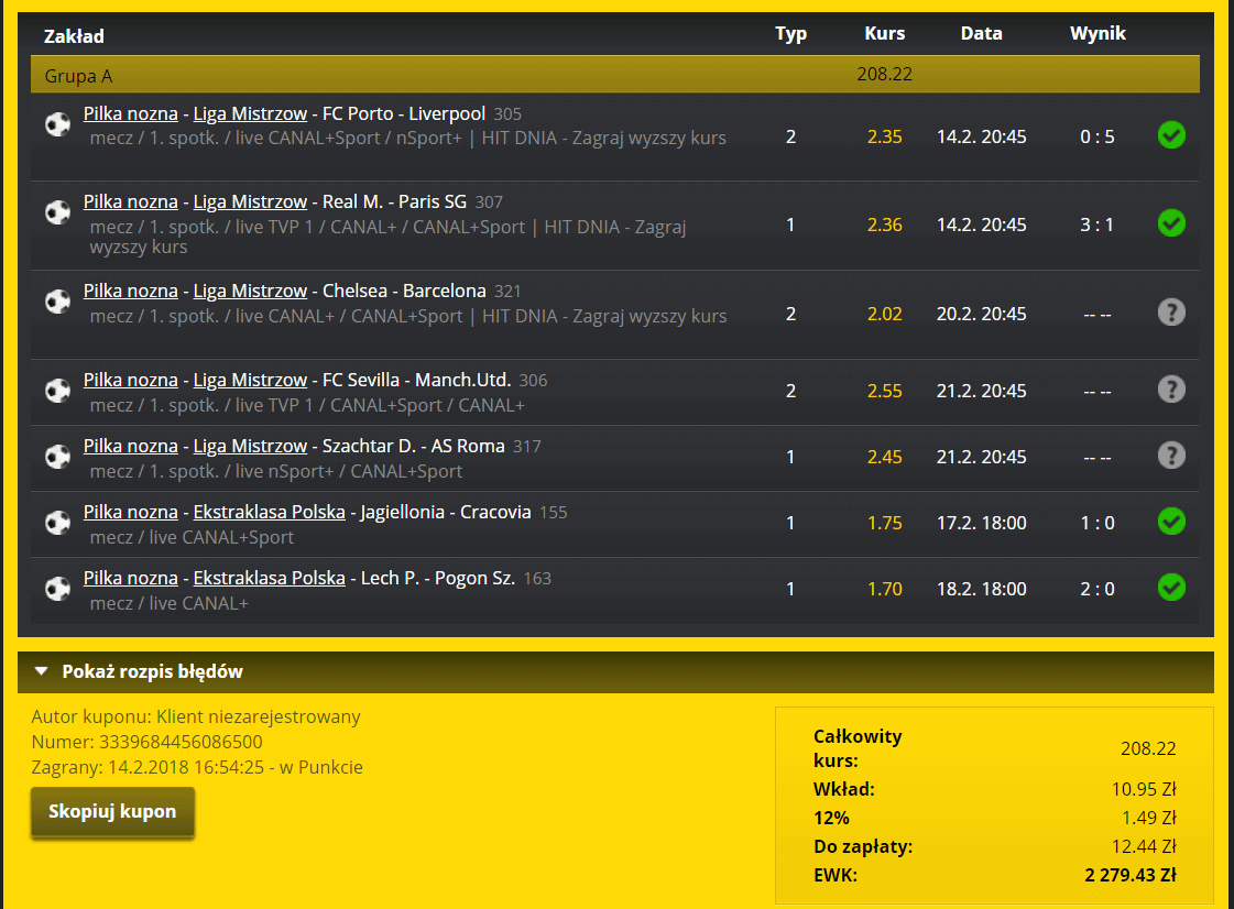 Do tej pory poprawnie wytypowane zostały cztery z siedmiu znajdujących się na kuponach zdarzeń. Wśród nich m.in. mecze Ligi Mistrzów oraz polskiej Ekstraklasy. Do pełni szczęścia klientowi Fortuny potrzebne są jeszcze zwycięstwa Szachtara Donieck, FC Barcelony i Manchesteru United we wtorkowych i środowych pojedynkach Champions League. Dyskusja na temat szans na powodzenie 474 kuponów klienta Fortuny rozgrzewa sympatyków zakładów bukmacherskich w social mediach. Aktualny rekord wygranej w Fortunie to blisko 400 000 zł.