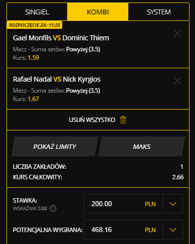 Jeden z dwóch hitowych pojedynków dzisiejszej nocy, a w pierwszym z nich francuski tenisista Gael Monflis (numer 10 ATP) powalczy z Austriakiem Dominikiem Thiem (nr 5 ATP). Nieco szybszą i łatwiejszą drogę do finału drugiej grupy pierwszej ćwiartki, które to spotkanie stanowi ten mecz, miał Monflis, który po drodze ze stratą jednego seta odprawił Lu Yen-hsuna z chińskiego Taipei, Chorwata Ivo Karlovicia i kwalifikanta z Łotwy Ernestsa Gulbisa. Thiem po drodze pogubił aż 3 sety, do zera ograł tylko Francuza Adriana Mannarino, z posiadaczem dzikiej karty Alexem Boltem oddał dwa sety do 7, a jednego takiego Taylorowi Fritzowi, który to Amerykanin był chyba najlepszym z sześciu tenisistów, którzy stanęli na drodze omawianej parze łącznie. Lekkim faworytem spotkania jest nie mniej jednak Austriak, który posiada zdecydowaną przewagę umiejętności, jednak zalety i wady obu graczy równoważą się, co pozwala przewidywać dość zacięty mecz, który z pewnością potrwa parę godzin. Ciężko decydować, kto z tego starcia wyjdzie zwycięsko, ale jedno jest pewne – nie będzie to mecz, który zakończy się w trzech setach i taki zakład proponujemy na to spotkanie.