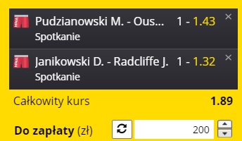 Nasz medalista olimpijski podejmuje niezwykle mocno bijącego Anglika który na swoim koncie ma już jedno zwycięstwo w KSW nad Chmielewskim. CO tu dużo pisać jeśli „Damiano” marzy o tym by nie była to jego ostatnia walka w KSW musi zrobić wszystko by tej walki nie przegrać. Presję ma ogromną bo wie ,że jeśli da ciała wszystko pójdzie na marne. Janikowski musi rozegrać tą walkę w swojej głowie to raz a dwa jak najszybciej sprowadzić swojego przeciwnika do parteru i tam rozgrywać z nim walkę. To jedyna opcja na pokonanie Anglika który słynie z dobrej stójki. Kursy na Janikowskiego nie są duże ale jesli połączymy sobie z Pudzianem a Ty coś jeszcze dorzucisz do swojego kuponu zrobi się kurs warty zagrania. Powodzenia