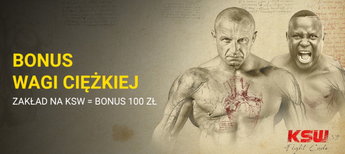 Przed nami kolejna już 59 gala KSW, w związku z tym dla wszystkich fanów sportów walki przygotowaliśmy wyjątkową promocję – „Bonus wagi ciężkiej”. Każdy, kto 20.03.2021 r. zdecyduje się obstawić kupon prematch zawierający dowolne zdarzenie z oferty KSW 59 otrzyma 100 zł gwarantowanego bonusu.