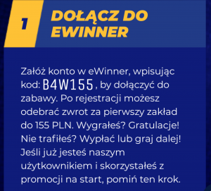 Dokonaj pierwszego depozytu za minimum 60PLN (pamiętaj ,że jeśli Twój pierwszy typ za 155PLN nie wejdzie – Ewinner zwraca Ci stawkę na Twoje konto główne które możesz wypłacić )
