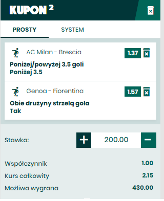 Milan miał problemy z tworzeniem sytuacji podbramkowych pod koniec poprzedniego sezonu i ma też w obecnym. Mimo zmiany trenera, w spotkaniu z Udinese piłkarze z Mediolanu… nie oddali ani jednego cennego strzału na bramkę przeciwników. Z kolei Brescia rozpoczęła sezon od niespodzianki, wygrywając na wyjeździe z Cagliari 1:0. Beniaminek zaprezentował się naprawdę nieźle, zwłaszcza jeśli chodzi o fazę defensywną. Dodając do siebie te czynniki, nawet jeśli Milan wygra, nie sądzimy żeby Krzysztof Piątek i spółka mieli strzelić więcej, niż jednego czy dwa gole. A Brescia będzie zadowolona z potencjalnego remisu, więc ich pomysłem na mecz z pewnością będzie to, żeby przede wszystkim nie stracić bramki.