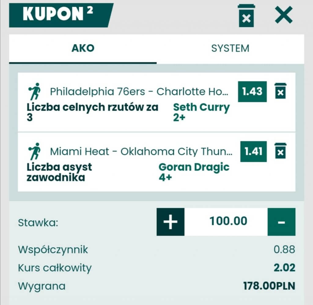 Aktualnie najgroźniejsza broń z dystansu w drużynie z Filadelfii to Seth Curry. Gra na bardzo dobrej skuteczności przez co zwiększa swoją liczbę minut i rzutów. Na parkiecie spędza średnio niecałe 30 minut rzucając wtedy ponad 16 punktów na mecz. W tym sezonie na 6 spotkań, w których wystąpił tylko w pierwszym meczu przeciwko Wizards nie pokrył proponowanej linii. Zabrakło wtedy 1 trójki i był to najgorszy jego występ pod względem rzutów zza łuku. Nawet w spotkaniu przegranym z Cavs gdzie zdobył jedynie 8 punktów pokrył linie 2 trójek. Dziś spodziewam się, że trafi zza łuku przynajmniej 2-3 razy.