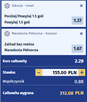 Szkocja i Izrael spotykają się po raz drugi w przeciągu nieco ponad miesiąca i tym razem w meczu w Glasgow cel jest o wiele ważniejszy, niż sukces w Lidze Narodów, a mianowicie jest to awans do ostatniego barażu, który przyznaje miejsce na Mistrzostwa Europy 2021. Miesiąc temu było 1:1 po bramkach Christiego i Zahaviego. Tym razem w meczu również brak zdecydowanego faworyta. Izrael ma po swojej stronie plus w postaci gwiazdy Zahaviego, który niedawno wrócił do Europy po latach w Chinach i obecnie gracz nieźle radzi sobie w szeregach PSV. Warto zwrócić również uwagę na wschodzącą gwiazdę izraelskiej piłki Solomona z Szachtara Donieck. Nieco gorzej jest po stronie defensywnej – Izrael stracił bramki w ostatnich dziewięciu meczach. Szkocja ze swojej strony do meczu podchodzi kontynuując pozytywną serię wyników – wspomniany remis z Izraelem to jedyna strata punktów wśród czterech zwycięstw z San Marino, Cyprem, Kazachstanem i Czechami, a w każdym z tych meczów reprezentanci Wysp Brytyjskich strzelali przynajmniej dwa gole, więc w tej drużynie również nie brakuje potencjału, który może zagwarantować w tym meczu bramki. Dlatego dla chętnych jest to dobry mecz na postawienie singlowego BTTS, a my do dubelka bierzemy pewniejszy zakład na przynajmniej dwa gole w tym spotkaniu.