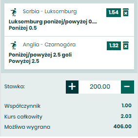 2,5 bramki dla samej Anglii, ale jako że Betfan nie oferuje takiej linii, wybieramy do AKO 3 bramki w całym meczu (jak Czarnogóra coś jakimś fartem dorzuci, nie będziemy