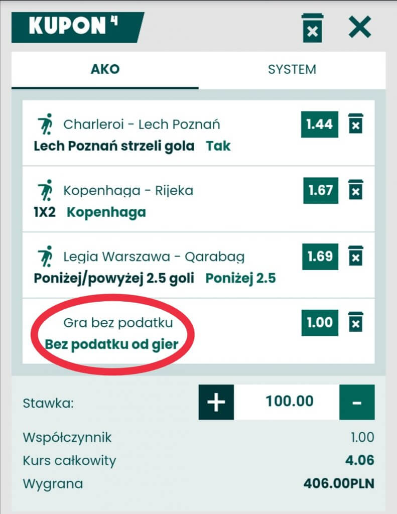 ➡️Wystarczy ,że stworzysz kupon AKO składający się z minimum 3 pojedynczych typów o minimalnym kursie 1,35, wchodzisz w promocje klikasz współczynnik +1.0 i dodajesz go do kuponu i gotowe i już – GRASZ W 100% BEZ PODATKU !