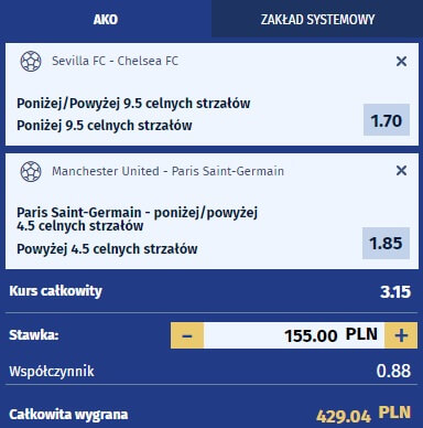 Przed nami spotkanie drużyn które walczą o 1 miejsce w tej grupie. Oba zespoły mają juz pewny awans i nie spodziewam się w tym spotkaniu szturmy na bramki z jednej lub z drugiej strony. Poprzedni mecz doskonale pamiętamy 0:0 i podział punktów. Nie zdziwiłbym się ,że dziś może być podobnie. Oba zespoły mocno zmęczone, mające awans, chcące złapać oddech. Juz w meczu z Tottenhamem widziałem, że Chelsea ma klasyczną zadyszkę. Było to raptem 3 dni temu więc myślę ,że dziś lepiej wyglądać nie będą. Sevilla to zespół który też nie leci do przodu na hurraaaa a raczej sumiennie rozgrywa swoje akcje i bardzo dobrze broni dostępu do własnej bramki dlatego mój typ na to spotkanie to poniżej 9.5 strzałów celnych w całym spotkaniu i wydaje sie to naprawdę dobrą opcją do naszego dubla bez ryzyka spełniając warunki promocji Ewinner
