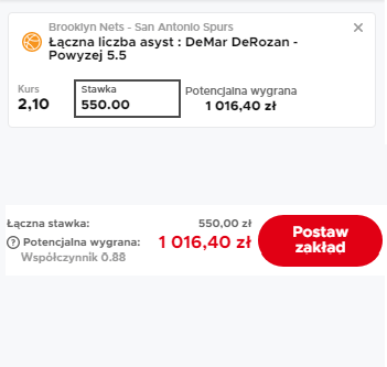 Mecz pomiędzy drużynami z prawie identycznym bilansem, które walczą o PO. Łatwiej zdecydowanie będzie osiągnąć to gospodarzom, którzy jak na razie zajmują miejsce premiowane awansem do drugiej fazy rozgrywek, natomiast Spurs tracą do bezpiecznego miejsca znacznie więcej. W tym meczu skłaniam się ku liderowi gości DeMarowi DeRozanowi, który pod nieobecność Aldridge’a jest samodzielną gwiazdą w swoim zespole. Patrząc na ostatnie statystyki DeRozana pod względem asyst to żal nie zagrać takiego typu. Ostatnie mecze to odpowiednio: 10, 7, 9, 9, 3, 7, 6, 6, 7, 2, 6. Są to statystyki od 1 lutego co pokazuje, że na 11 meczów aż 9 krotnie pokrywał proponowaną linię. W sezonie asystuje on średnio 5,4 razy na mecz, a patrząc na podane przeze mnie ostatnio mecze to ta statystyka wzrasta do prawie 7 asyst na mecz. Dziś spotkanie bardzo ważne zarówno dla jednych i drugich i spodziewam się wyrównanej walki więc co za tym idzie wielu minut dla DeRozana. W pierwszym meczu między tymi drużynami udało mu się zdobyć idealnie 6 asyst i dziś liczę na powtórkę, bo kurs warty ryzyka.