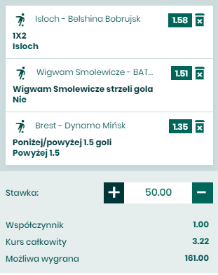 Pojedynek jednego z solidnej wyglądających zespołów Islocha Mińsk z przesłabą Belshiną. Gospodarze tego pojedynku u siebie trzepią punkty niemiłosiernie, twierdzę Isloch zdobył w pięciu meczach ligowych w Mińsku jedynie Słuck i to po zaciętym boju. Belshina w tym sezonie zdobyła zaledwie dwa punkty i stanowi czerwoną latarnię ligi. Nad tym meczem nie ma się co za wiele rozwodzić – drużyna, która gra u siebie koncert powinna bez trudu wygrać z outsiderami. Gramy na zwycięstwo gospodarzy.