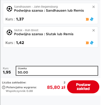 Białoruski wyjątek w tej niemieckiej edycji bloga. Słuck, który na początku sezonu w obliczu słabości pierwszej trójki z poprzedniego sezonu odpalił petardę i przebojem wdarł się na pozycję lidera, szybko poszybował też w dół po dwóch porażkach z rzędu. Ich przeciwnikiem w sobotnim spotkaniu będzie Rukh Brest (ciekawostka – klub założono w 2016 r. – wyznacznik tego, ile w białoruskiej Wyższej Lidze mogą zdziałac pieniądze), klub z ambicjami na środek tabeli. Słuck u siebie gra nieźle – dwie wygrane, remis i porażka, średnio dwie bramki strzelona i więcej niż jedna stracona w meczach u siebie. Goście z Brześcia na wyjazdach również nie grają tragedii – dwie wygrane, dwa remisy i solowa porażka, strzelona średnio bramka na wyjazd i stracone tylko 3 w 5 meczach. Słuck pozostaje faworytem tego zestawienia i jest to dobry bet dla lubiących ryzyko, ale Rukh Brest potrafi dobrze bronić (szczególnie na wyjazdach) i jeżeli uda im się strzelić bramkę jako pierwszym, potem gospodarzom może nie być zbyt łatwo. Gramy na Słuck zabezpieczając kupon podpórką na wypadek remisu.