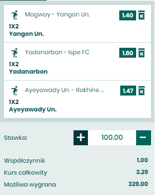 W tabeli Ayeyawady podejmuje szóste Rakhine United. Gospodarze ostatni mecz u siebie przegrali w… czerwcu ubiegłego roku (właśnie z Rakhine) i kontynuują serię piętnastu meczów bez porażki u siebie zamieniając swój obiekt w prawdziwą twierdzę. Rakhine na wyjazdach gra bardzo średnio, przeplatając występy lepsze znacznie gorszymi i co za tym idzie raczej nie mają szans z rozbijającym u siebie wszystkich Ayeyawady, które będzie chciało zrewanżować się za porażkę sprzed niespełna roku. Gramy na trzecią nudną wygraną faworytów.